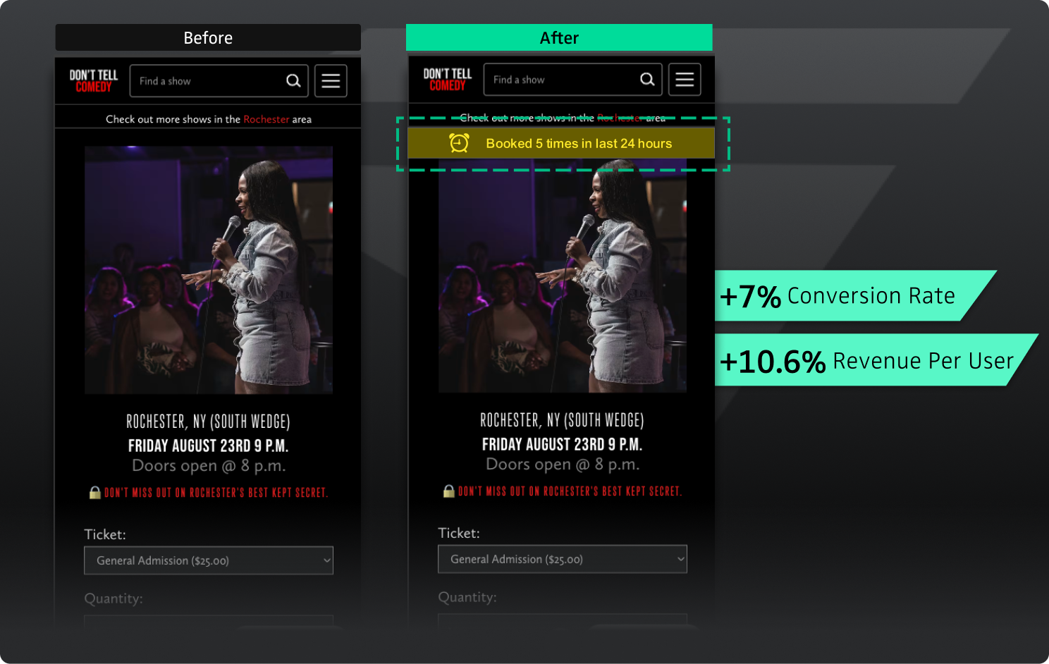 Don't Tell Comedy's ticket sales lacked urgency. With no clear indicator of demand, visitors felt no pressure to book immediately, leading to high bounce rates and lost revenue.